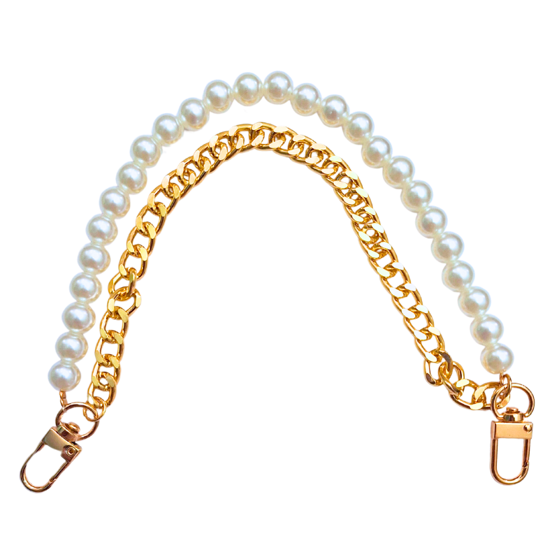 Adicione um toque sofisticado às suas bolsas com esta elegante Alça com Corrente Dourada e Pérola Acrílica.