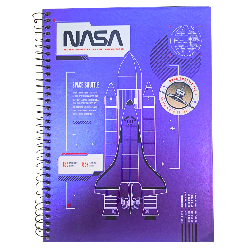 Este caderno universitário é perfeito para fãs do tema espacial e da Nasa.