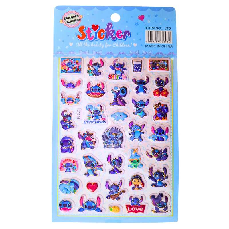 Com design superfofo, os adesivos apresentam o Stitch em diferentes poses e expressões, todas com acabamento em relevo 3D que garante um efeito visual encantador e tátil.