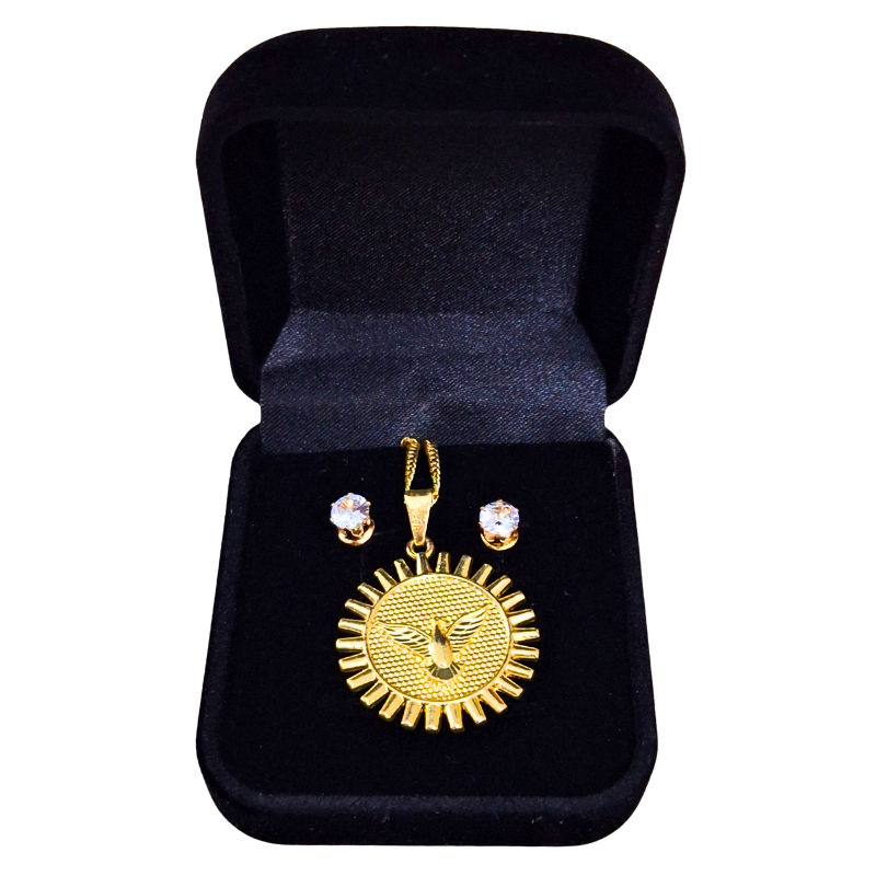 Conjunto de corrente e brincos com pingente Divino Espírito Santo modelo 2 dourado, elegante e versátil.