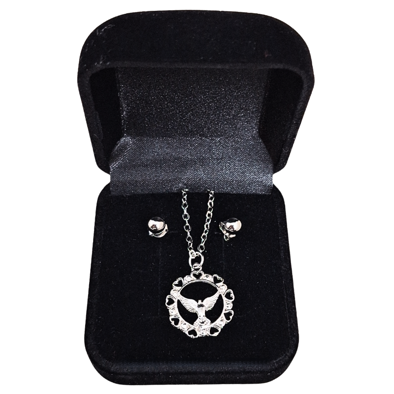 Conjunto de corrente e brincos com pingente Divino Espírito Santo modelo 3 prata, elegante e versátil.