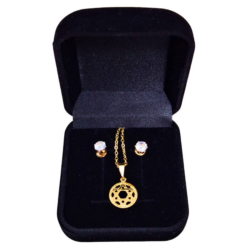 Conjunto de corrente e brincos com pingente estrela de Davi dourado, elegante e versátil.
