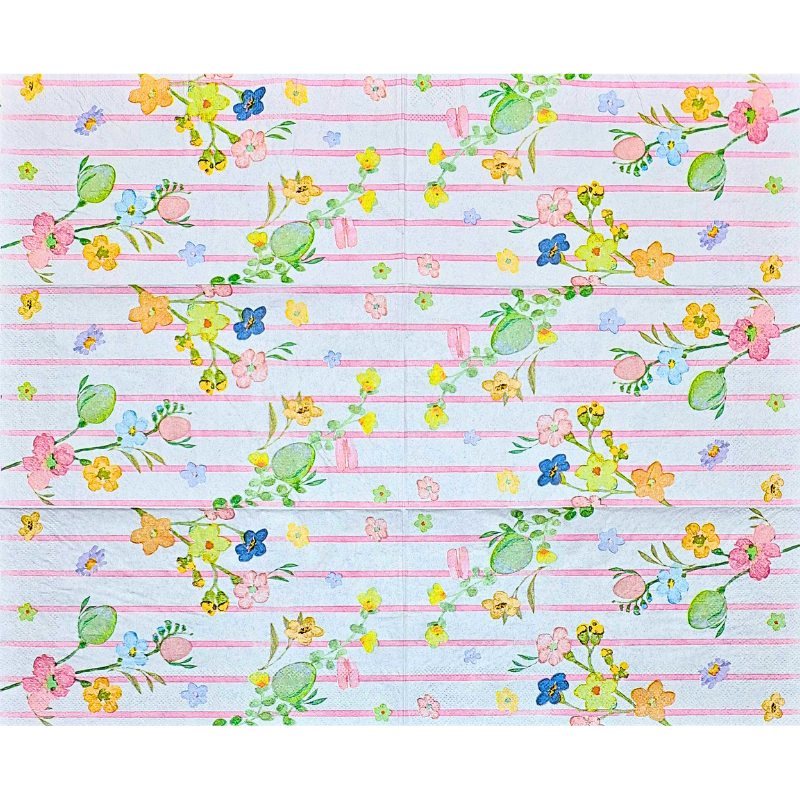 Tema: Páscoa Modelo 14 com flores e ovos de Páscoa em fundo listrado rosa.