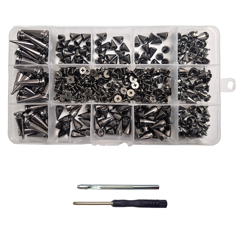180 Peças entre spikes de tamanhos variados (10 mm / 12 mm / 14 mm e 24 mm) e parafusos.