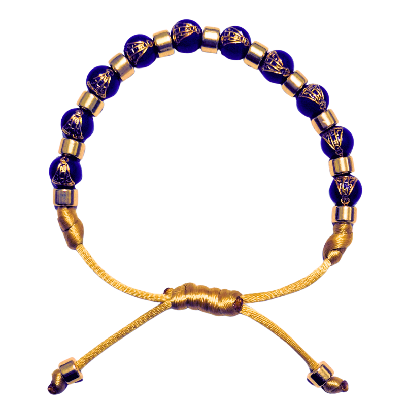 Conta com 10 contas na cor azul, cada uma estampada com a imagem de Nossa Senhora Aparecida, símbolo de proteção, esperança e bênçãos.